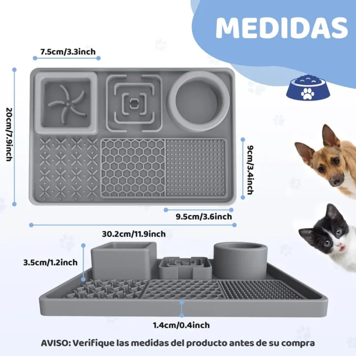 A diferencia de otras Alfombrilla para lamer del mercado, esta lick mat para perro se puede utilizar para múltiples propósitos ya que cuenta con un compartimento para agua y dos áreas de alimentación para colocar comida solida como croquetas, premios y carne seca. Además, cuenta con tres zonas distintas para lamer alimentos como yogur y crema de cacahuate. Adicionalmente, el tapete para perro comida contribuye con la limpieza de lengua y dientes de su mascota